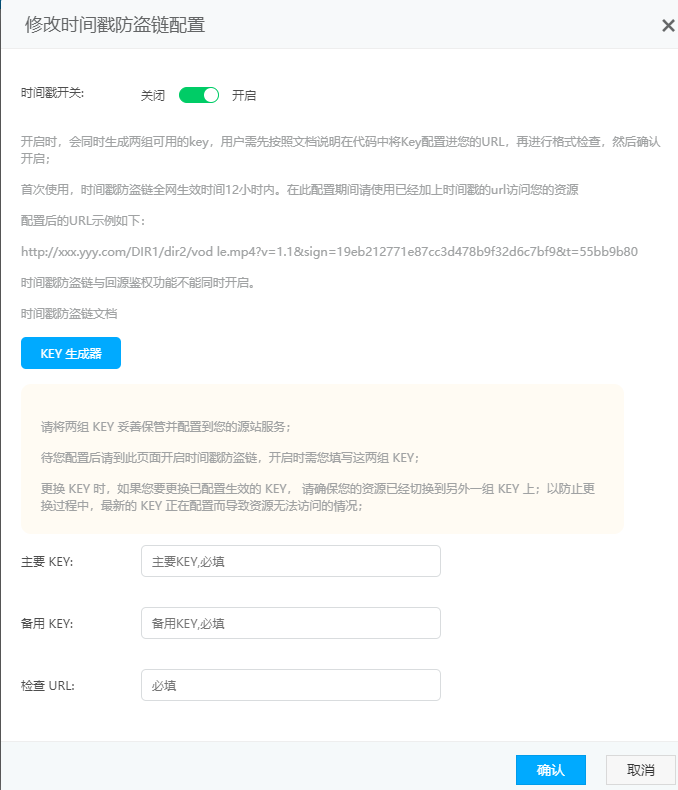 之后将 url 地址填写在上图中的 检查url 处验证。 例2:URL http://xxx.yyy.com/DIR1/中文/vodfile.mp4?v=1.2 ,假设 key = 12345678 ;T = 55bb9b80 , S = 12345678/DIR1/%E4%B8%AD%E6%96%87/vodfile.mp455bb9b80 ,SIGN = 6356bca0d2aecf7211003e468861f5ea ,访问 url 为: http://xxx.yyy.com/DIR1/%E4%B8%AD%E6%96%87/vodfile.mp4?v=1.2&sign=6356bca0d2aecf7211003e468861f5ea&t=55bb9b80